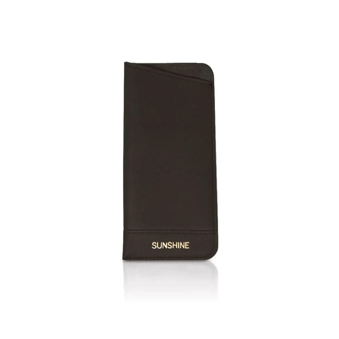 Étui à lunettes en cuir noir, gravure à la feuille d’or.