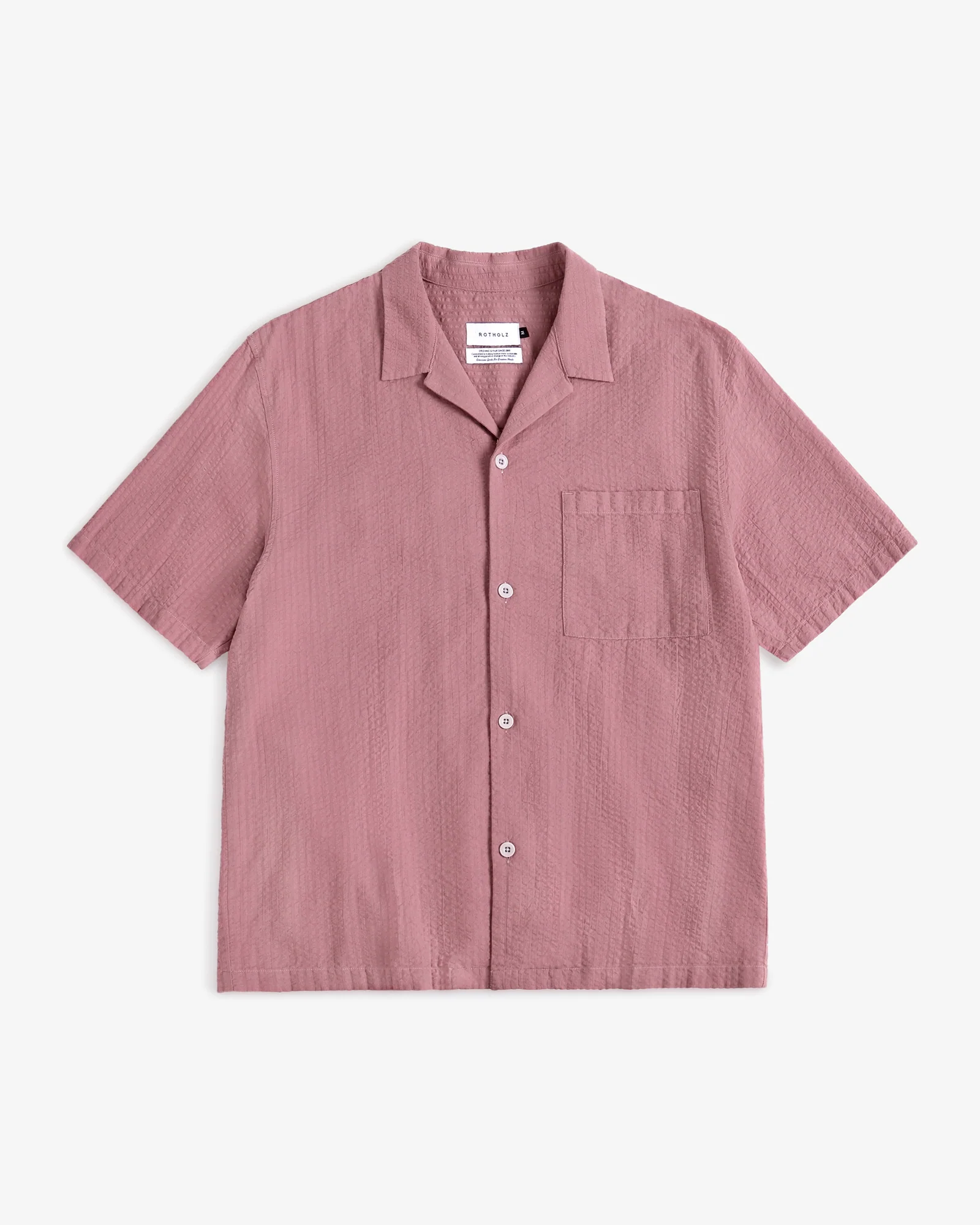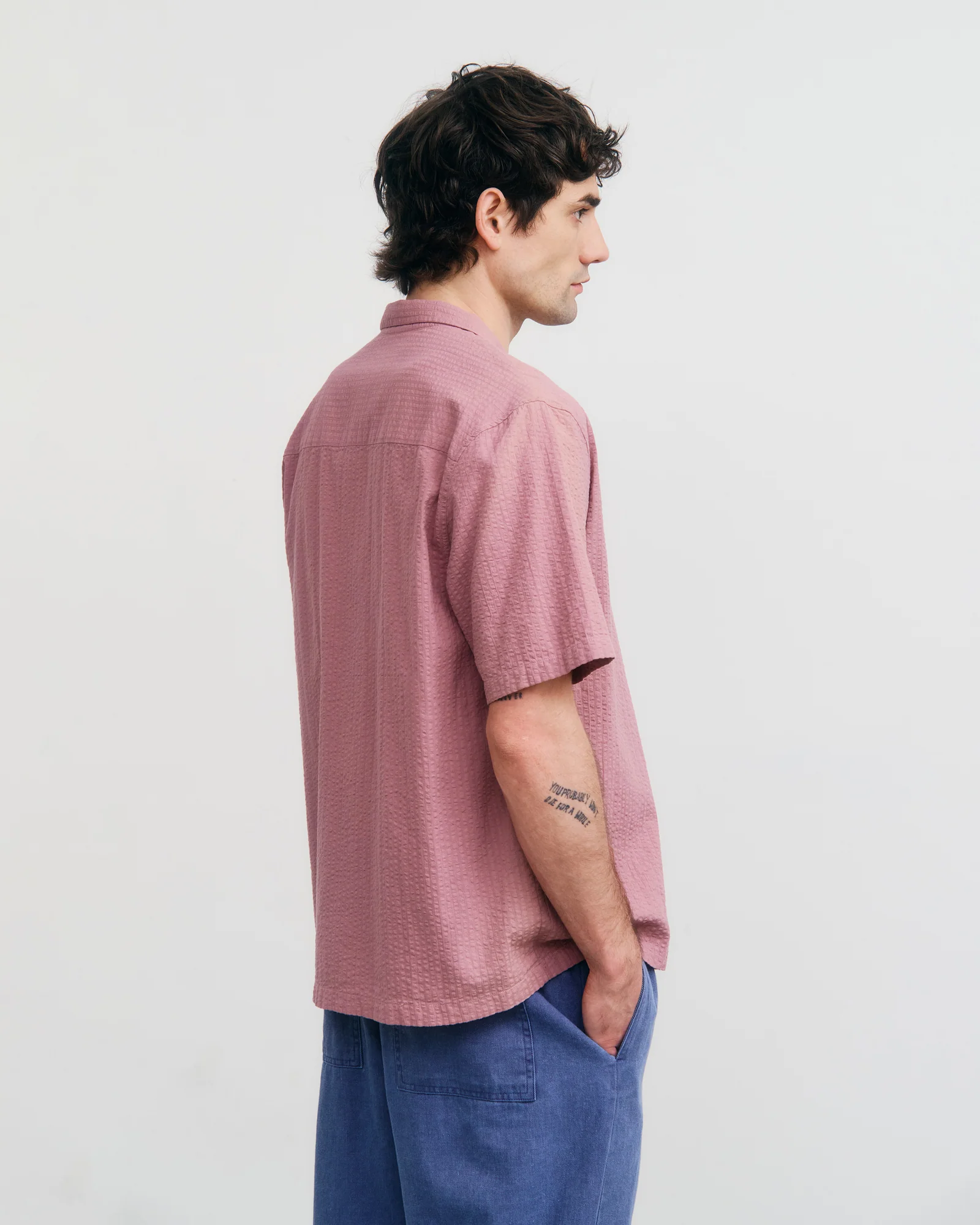 Chemise à manches courtes, col cranté et poche poitrine plaquée. Confectionnée à la main au Portugal en seersucker de coton biologique rose.