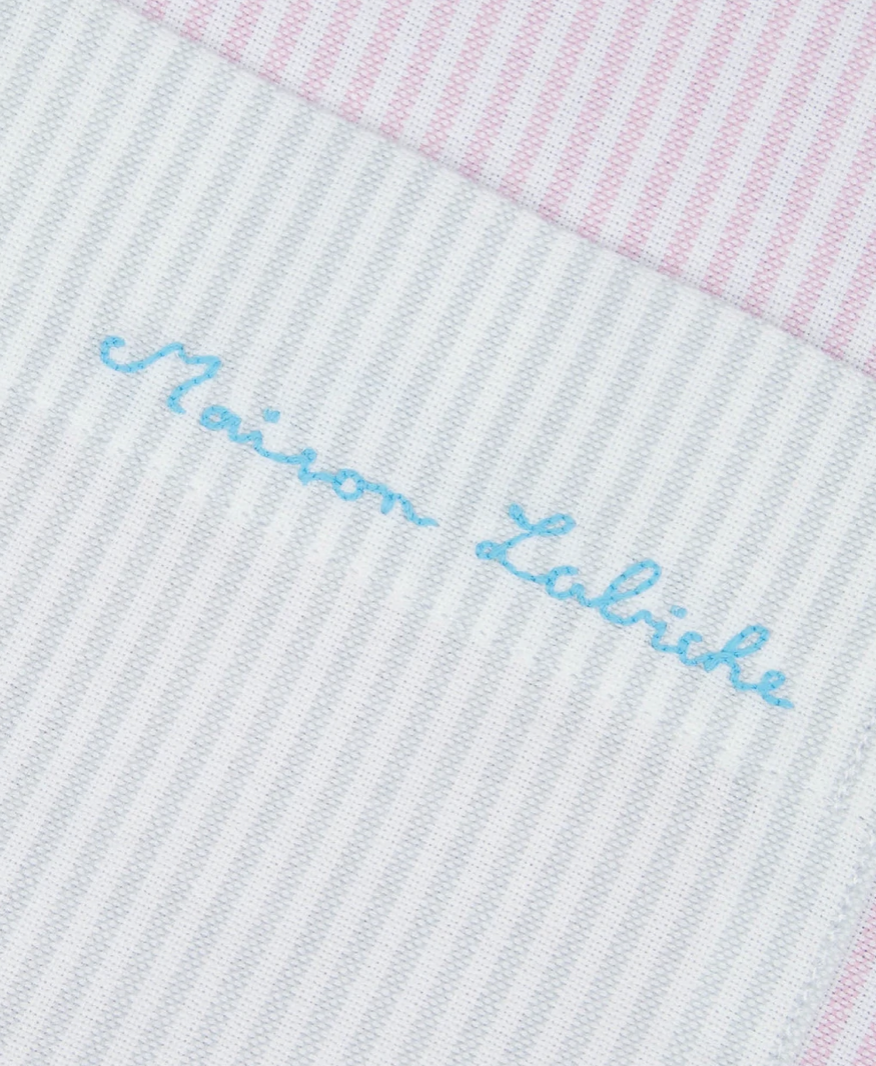 La typographie, brodée et inspirée des blouses de pensionnaires françaises des années 50 devient la signature de la marque. Aujourd’hui, les tissus sont choisis avec soin en privilégiant les matières naturelles et sont ensuite produits principalement au Portugal.