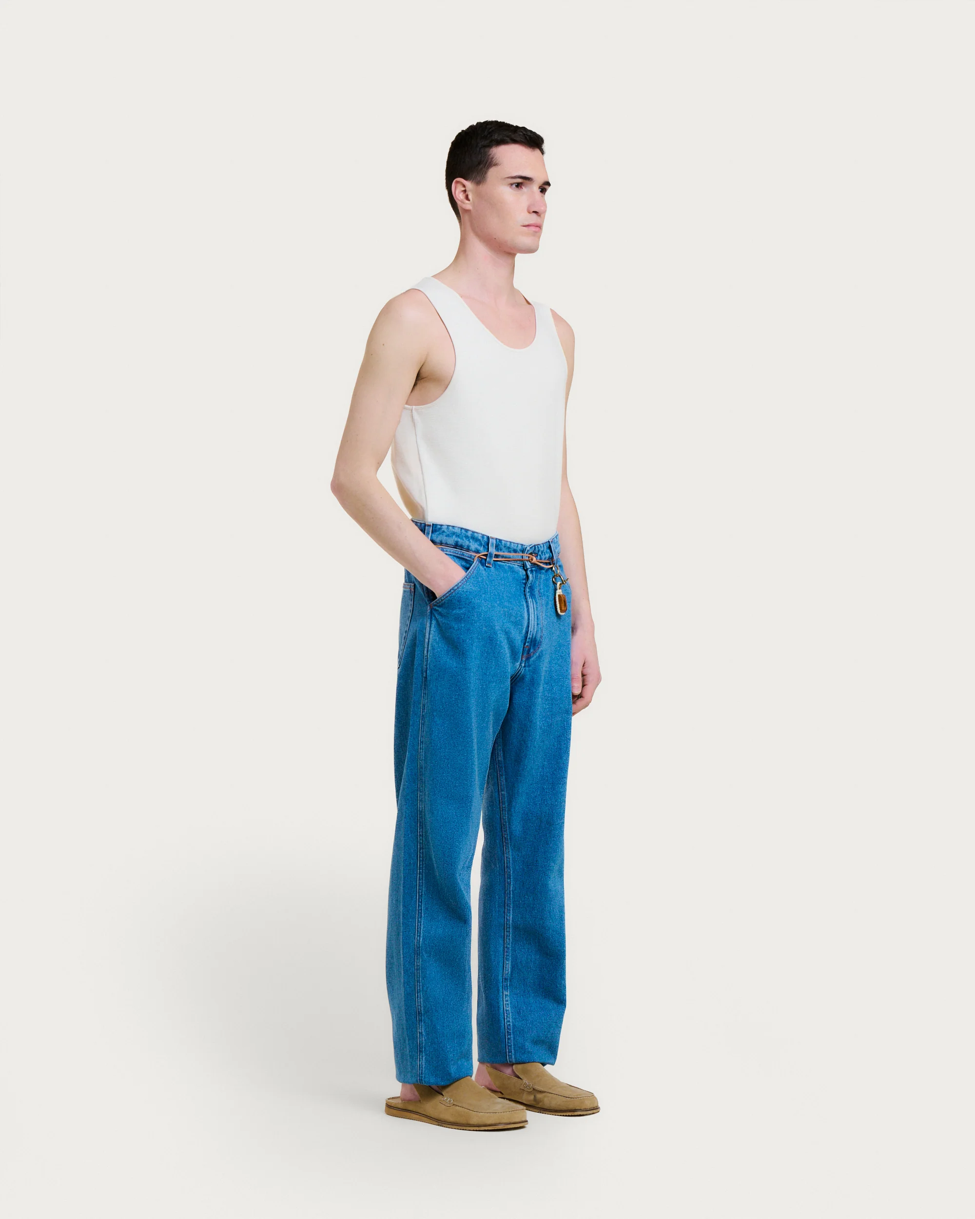Le Jabali Wide est une relecture contemporaine du jean 5 poches, avec une coupe large et confortable. Décliné en version bleached, il joue avec les contrastes : surpiqûres apparentes, poche monnaie oversize, et cordon en cuir végétal noué façon signature HOMECORE. L’étiquette en cuir synthétique complète cette pièce iconique, pensée pour durer.