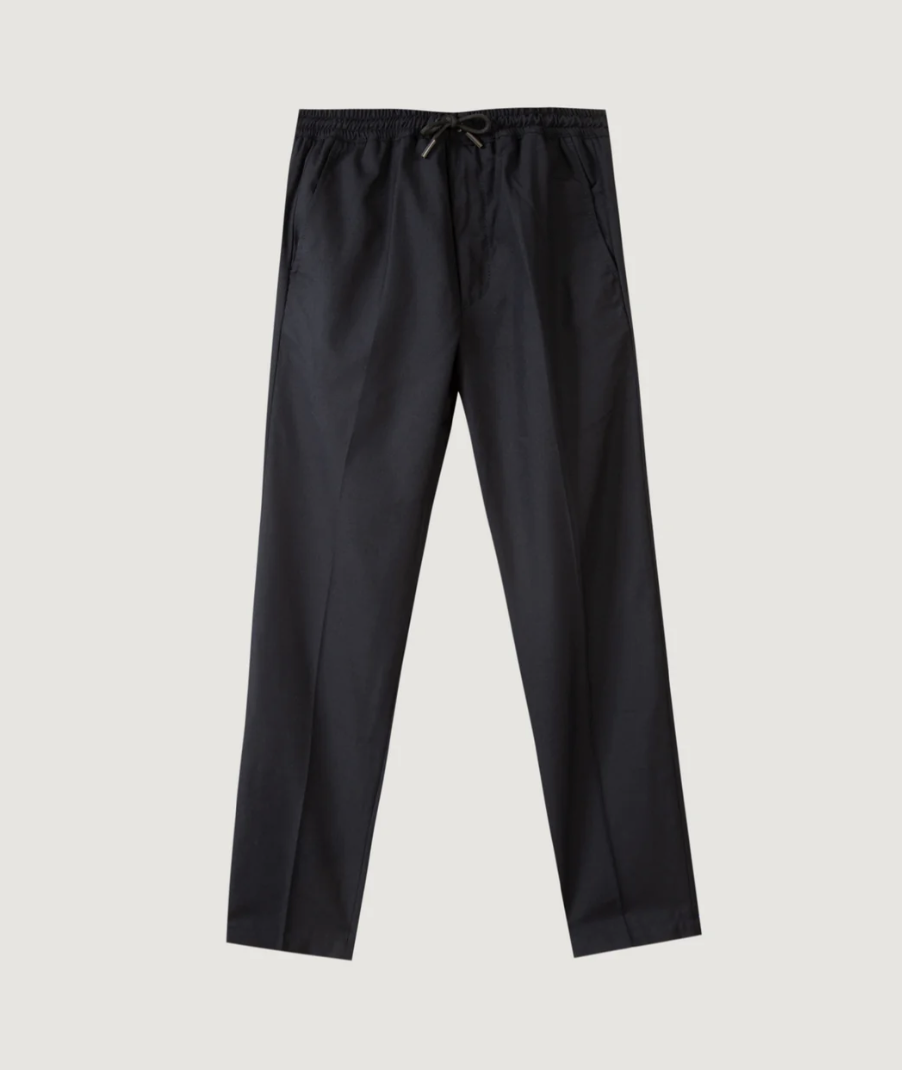Notre pantalon emblématique Arcade présente une coupe carotte avec des jambes fuselées, une taille élastiquée avec cordon de serrage, des poches italiennes devant et des poches passepoilées dos.
