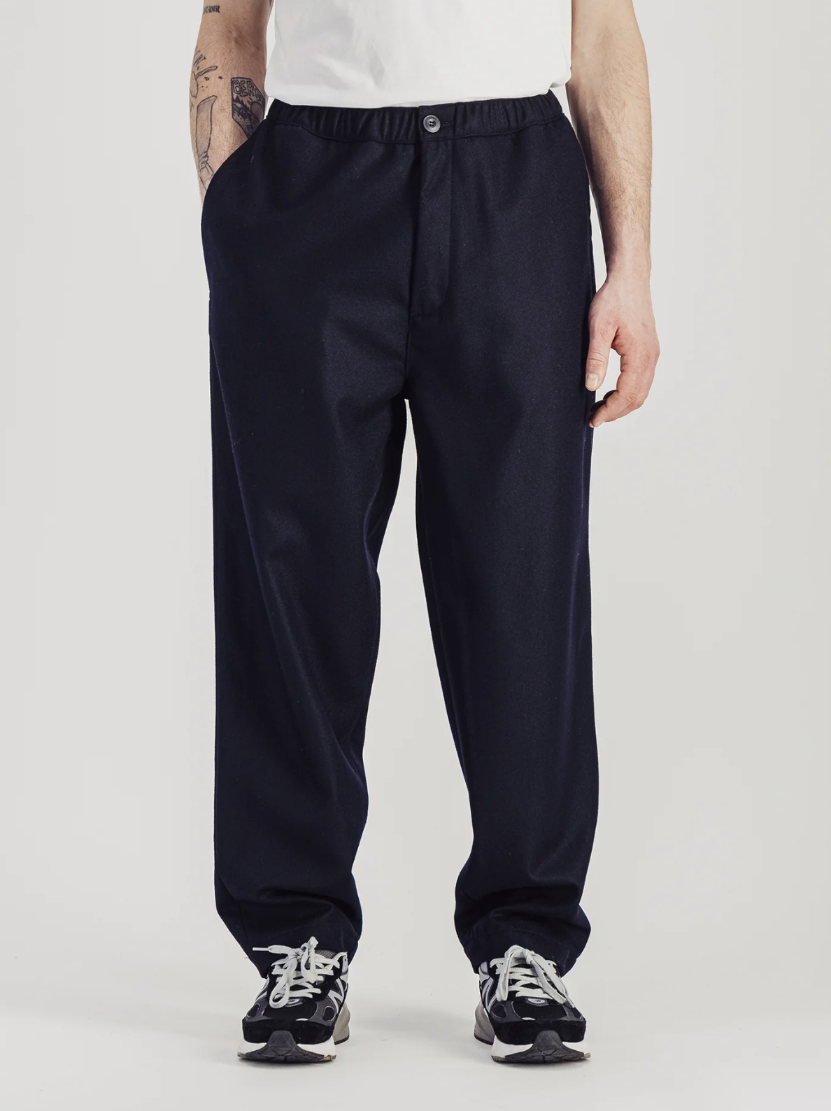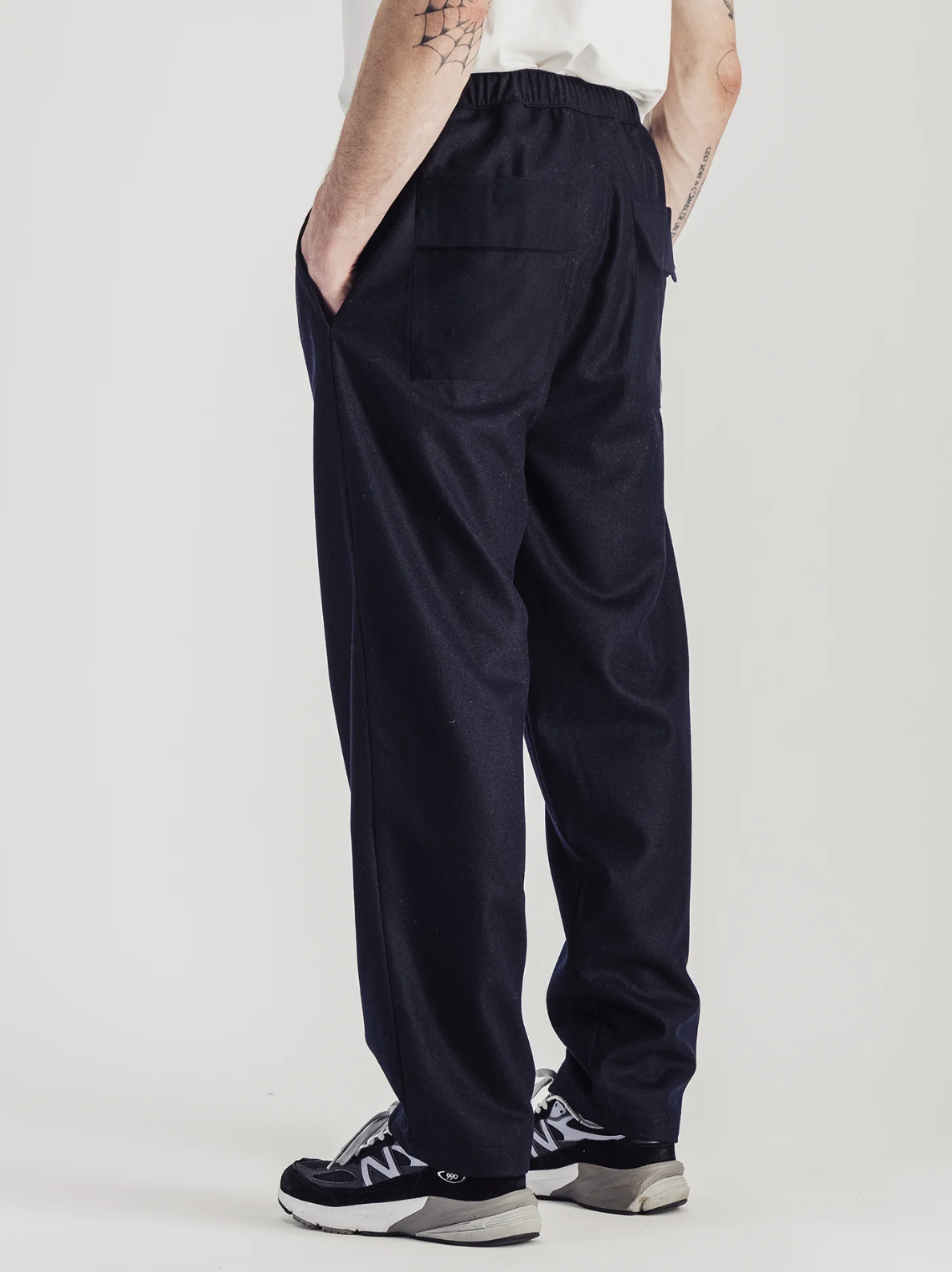 Pantalon décontracté qui allie le confort d’un pantalon de jogging avec sa coupe large et sa taille élastiquée à l’élégance d’un pantalon de tailleur grâce à son délicat tissu 100% laine.