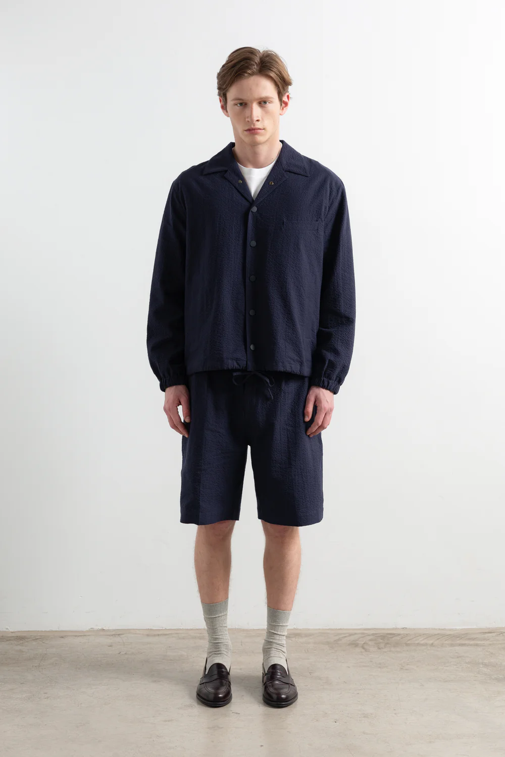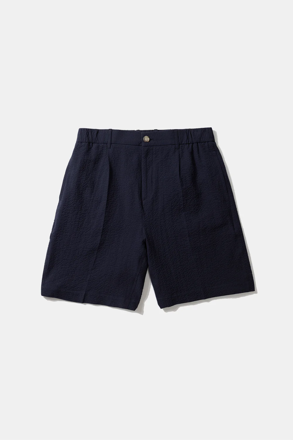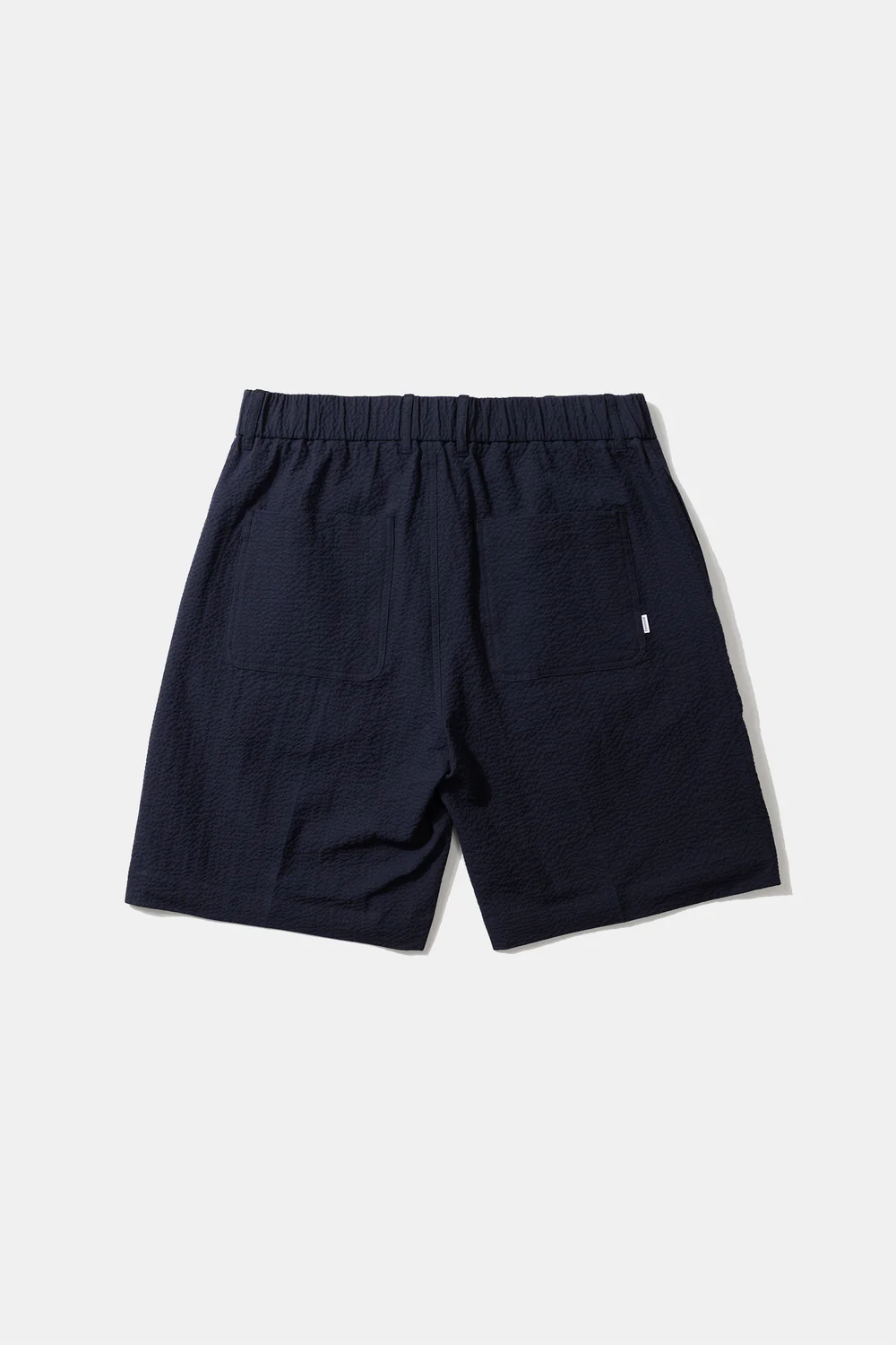 Short en seersucker bleu marine. Poches plaquées arrondies à l’arrière. Étiquette de la marque en haut à droite au dos.