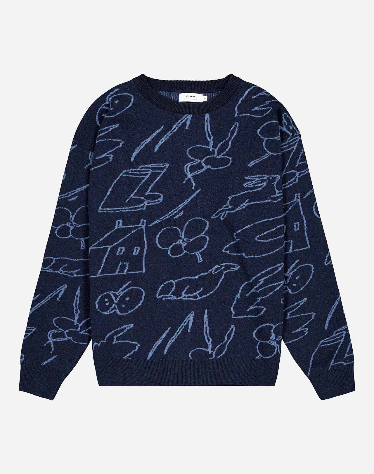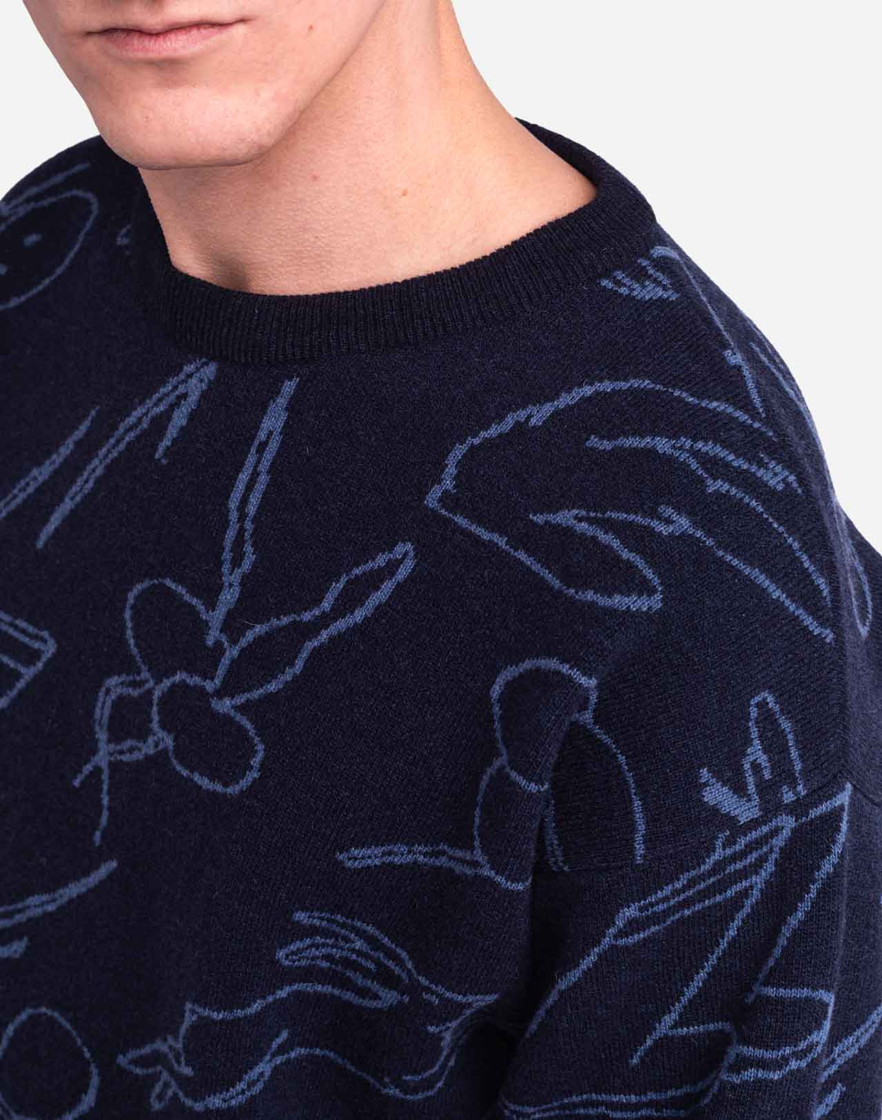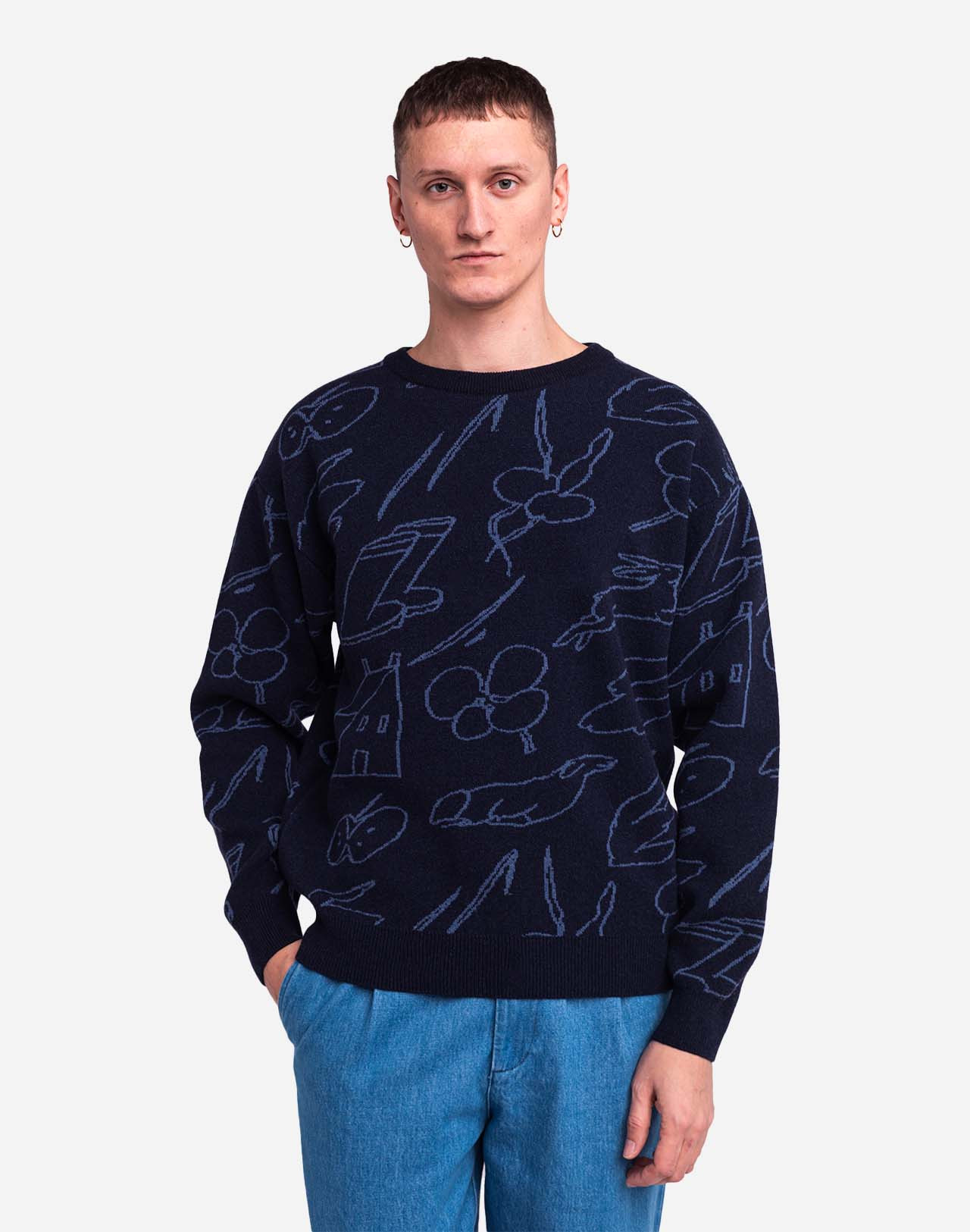 Un pull 100% laine, joliment mis en relief par les illustrations de Gabrielle Monceaux tricotées en jacquard. Sa coupe ample lui donne tout le confort nécessaire pour appréhender l’hiver.