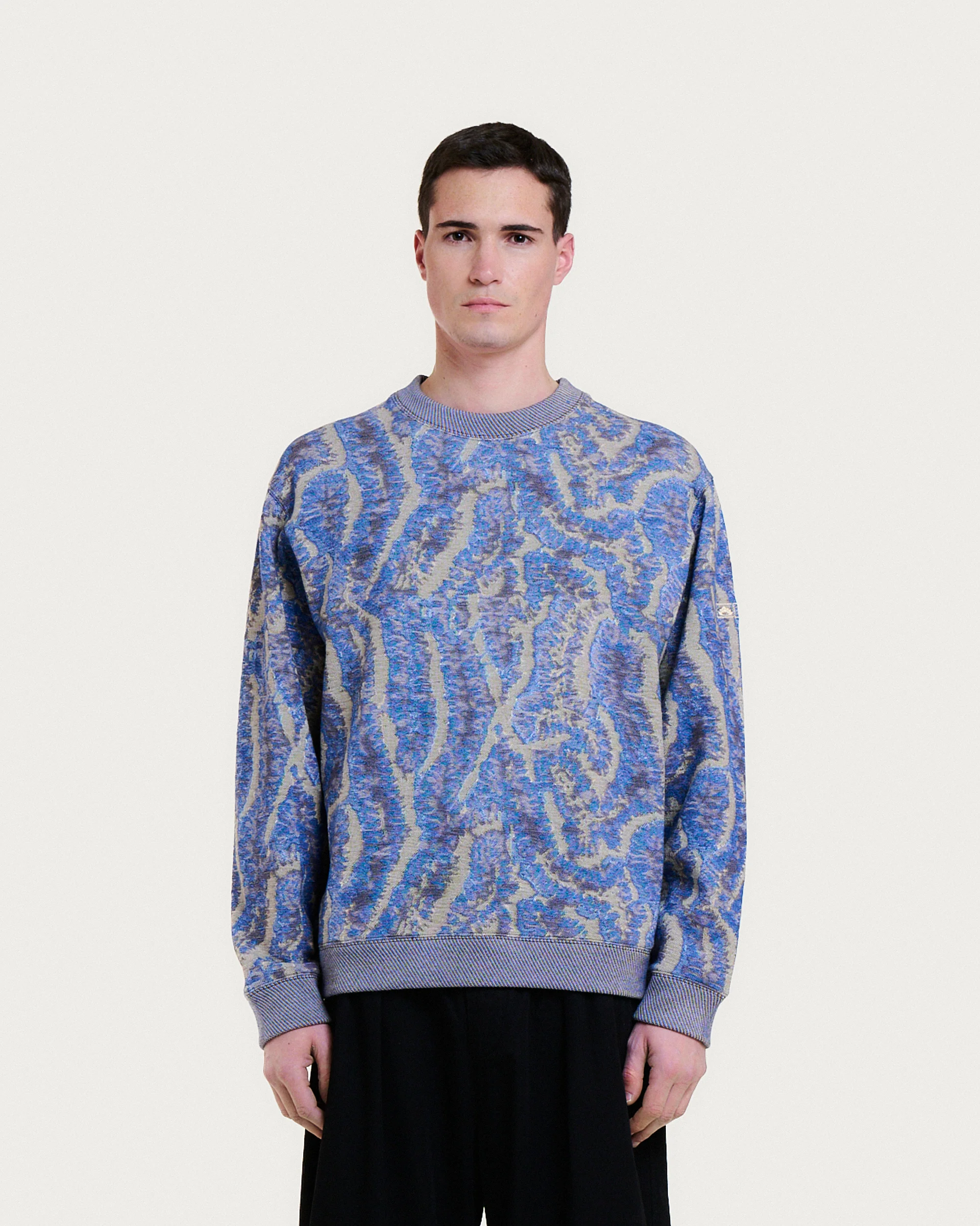 Le Pac Coral blue multi est un sweatshirt à coupe droite doté d’une broderie sur la manche et d’une couture rouge au dos, signature Homecore. Le motif jacquard inspiré des coraux de Zanzibar enrichit la pièce de formes organiques et textures vivantes, créant un style poétique et dynamique.